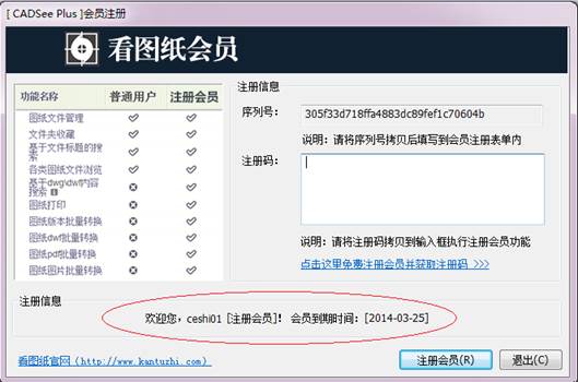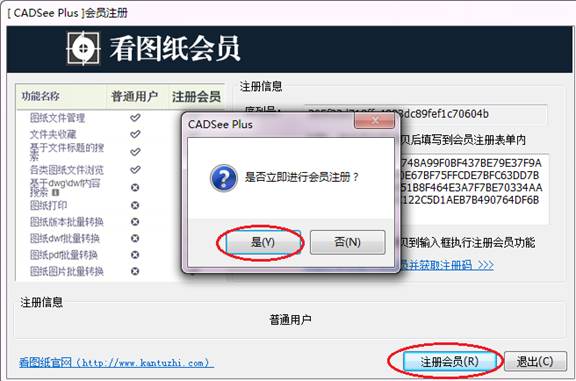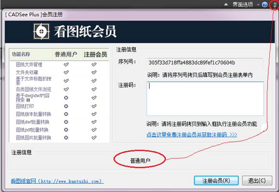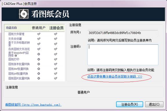 点击主页【会员注册】图标,发起注册。弹出【CADSee Plus】会员注册界面,进行【点击这里注册会员并获取注册码>>>】操作。