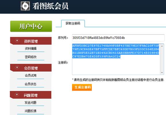 Ø 点击“会员中心”->【会员状态】-》【点击获取会员注册码】按钮,并将生成的注册码拷贝到“客户端”注册信息中表的【注册码】窗口。