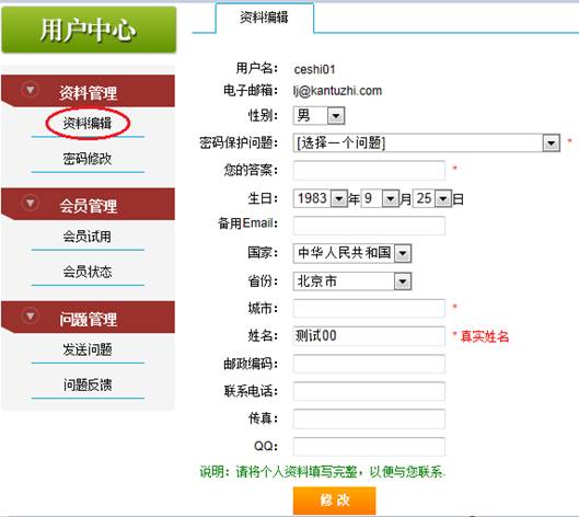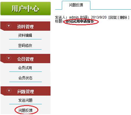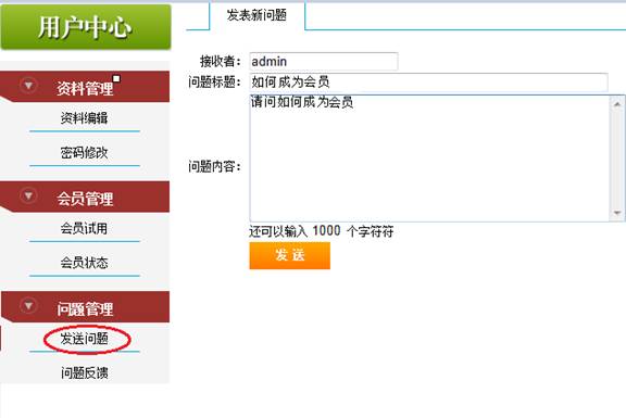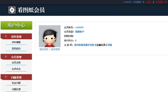 会员登录后,进入会员中心,可进行个人资料管理、会员管理以及问题管理,如下图所示。