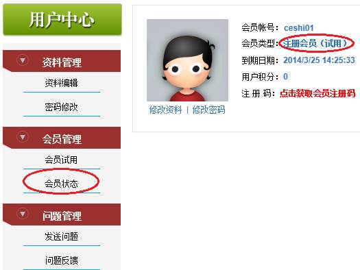 (1)点击“会员试用”界面的【申请试用】按钮,提示注册成功,并查看【会员状态】,此时会员类型更新为【注册会员(试用)】,如下图。