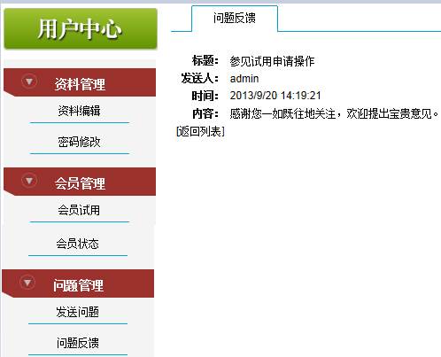 会员登录后,进入会员中心,可进行个人资料管理、会员管理以及问题管理,如下图所示。